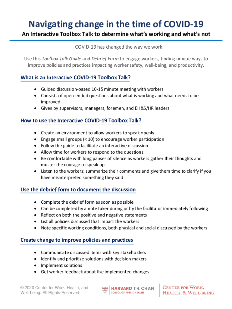 Navigating change in the time of COVID-19 An Interactive Toolbox Talk to determine what's working and what's not COVID-19 has changed the way we work. Use this Toolbox Talk Guide and Debrief Form