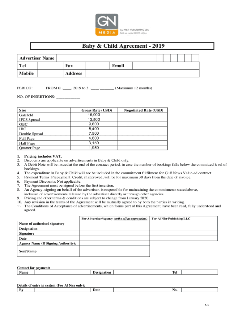 TelFaxMobileAddressPERIOD:Mailroom 01.___. 2019 to 31.___.___ (Maximum 12 months)NO. OF INSERTIONS: ___Size