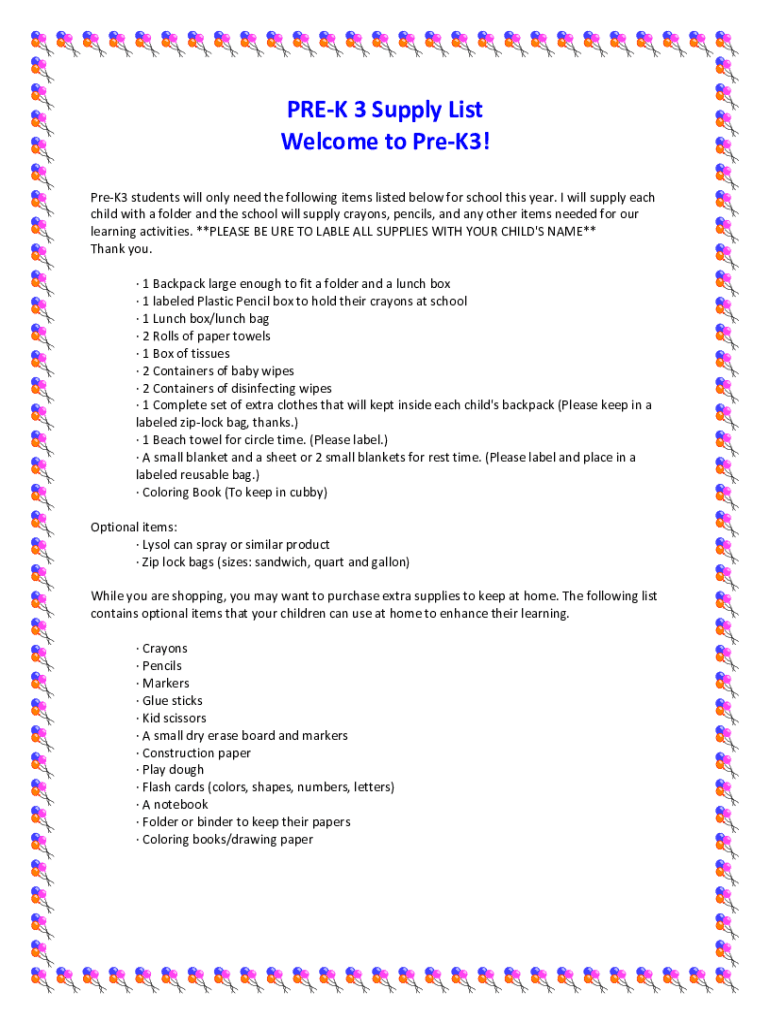 PREY 3 Supply List Welcome to PreK3! PreK3 students will only need the following items listed below for school this year. I will supply each child with a folder and the school will supply crayons,