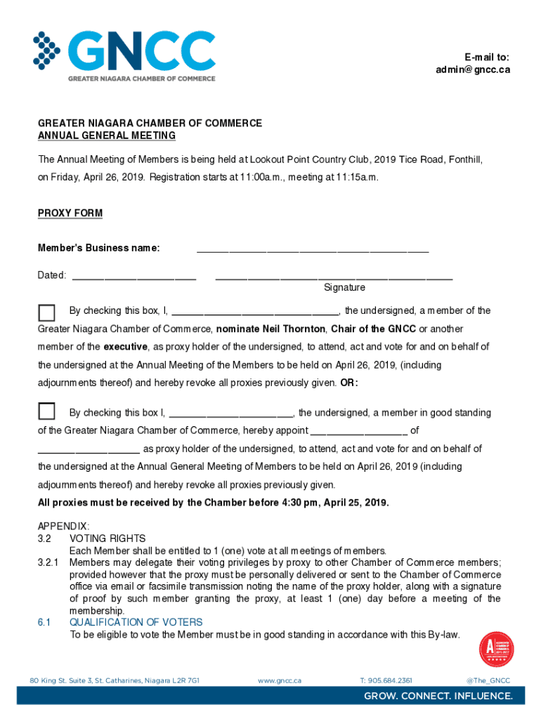 Email to: admin@gncc.caGREATER NIAGARA CHAMBER OF COMMERCE ANNUAL GENERAL MEETING The Annual Meeting of Members is being held at Lookout Point Country Club, 2019 Time Road, Foothill, on Friday, April