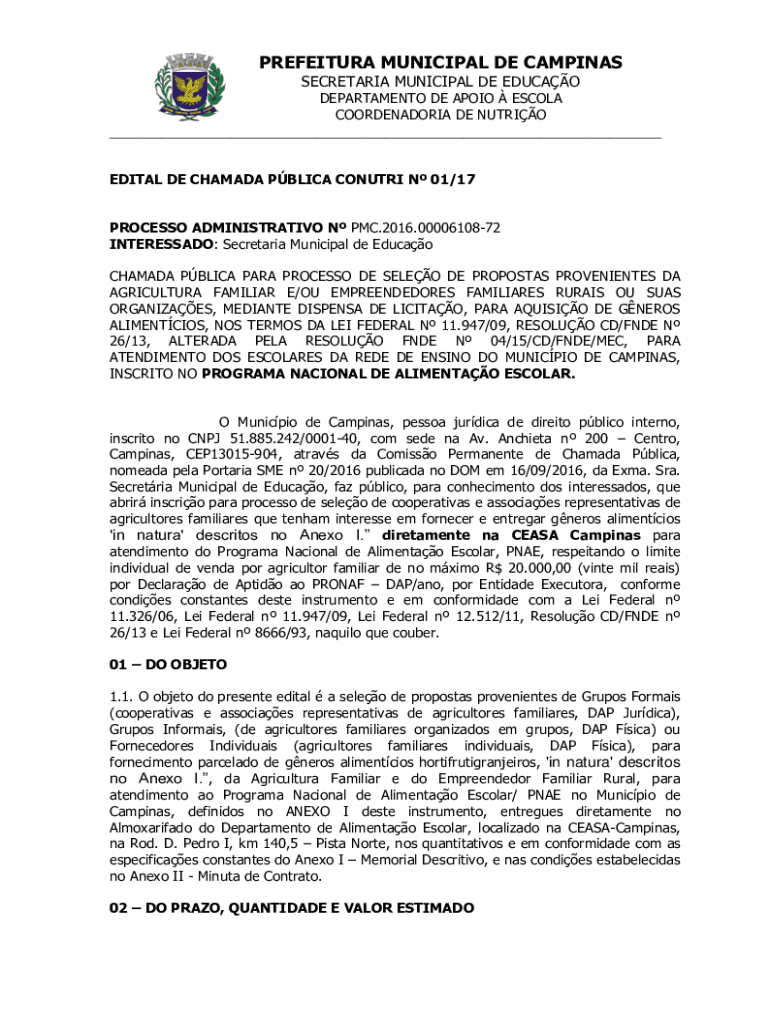 PREFECTURE MUNICIPAL DE CAMPINAS SECRETARIAT MUNICIPAL DE EDUC AO DEPARTMENT DE APRIL ES COLA COORDENADORIA DE NUTRIA___ EDIT AL DE CHAM ADA PBL ICA CONTRA N 01/17 PROCESS ADMINISTRATIVE N PMC.2016.0000610872