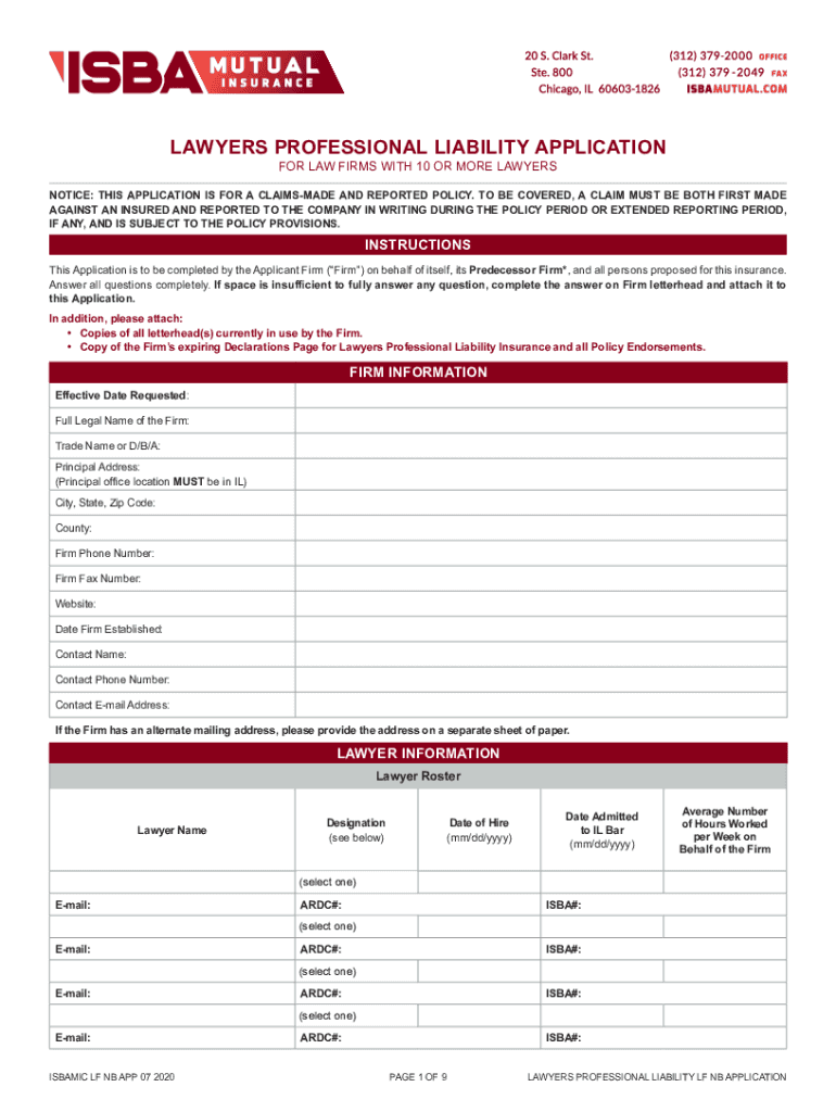 LAWYERS PROFESSIONAL LIABILITY APPLICATION FOR LAW FIRMS WITH 10 OR MORE LAWYERSNOTICE: THIS APPLICATION IS FOR A CLASSMATE AND REPORTED POLICY. TO BE COVERED, A CLAIM MUST BE BOTH FIRST MADE AGAINST