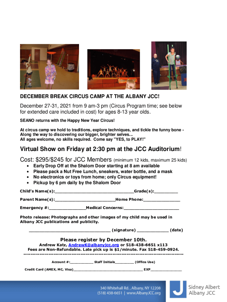 DECEMBER BREAK CIRCUS CAMP AT THE ALBANY JCC! December 2731, 2021 from 9 am3 pm (Circus Program time; see below for extended care included in cost) for ages 813-year-olds. SEAN returns with the Happy
