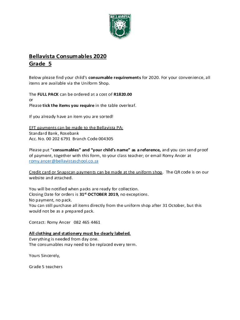 Bella vista Consumables 2020 Grade 5 Below please find your child\'s consumable requirements for 2020. For your convenience, all items are available via the Uniform Shop. The FULL PACK can be ordered