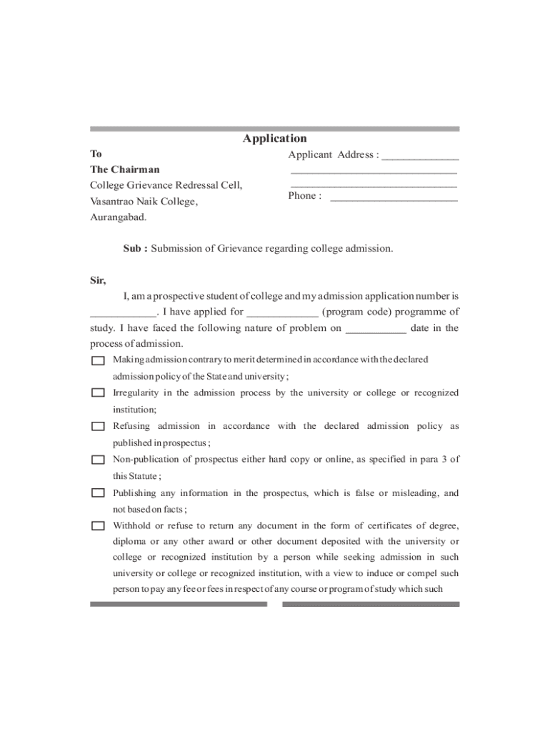 Application Applicant Address : ___ ___ ___ Phone : ___The Chairman College Grievance Reparation Cell, Casandra Nail College, Aurangabad. Sub : Submission of Grievance regarding college admission.