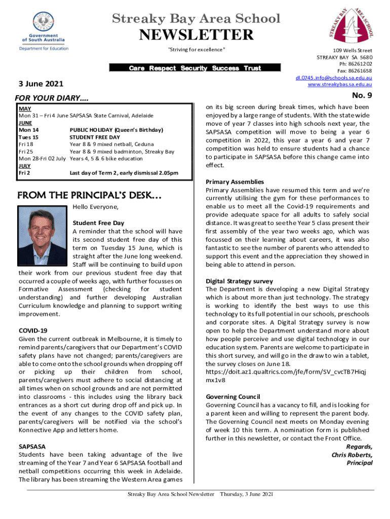 Streaky Bay Area SchoolNEWSLETTER \” Striving for excellence\” Care Respect Security Success Trust3 June 2021109 Wells Street STREAKY BAY SA 5680 pH: 86261202 Fax: 86261658 dl.0745.info@schools.sa.edu.au