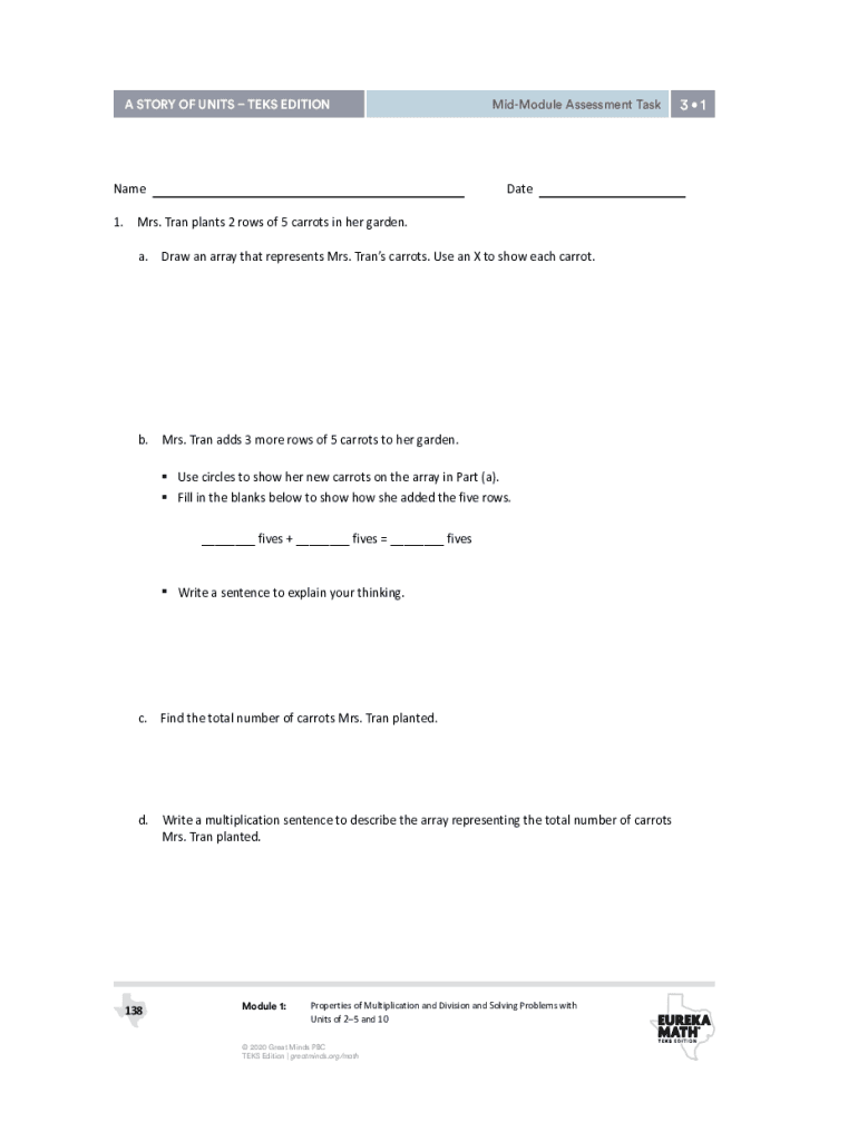 A STORY OF UNITS TENS EDITIONMidModule Assessment Task31MidModule Assessment TaskModule 1Name Date 1. Mrs. Tran plants 2 rows of 5 carrots in her garden. a. Draw an array that represents Mrs. Trans
