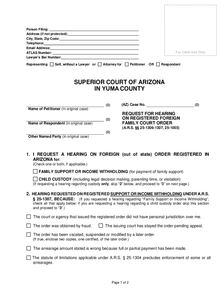 SELF-SERVICE CENTERINSTRUCTIONS: HOW TO OBJECT TO REGISTERING ANOTHER STATES FAMILY COURT ORDER IN ARIZONA STEP 1: FILL OUT THE REQUEST FOR HEARING FORM. Follow these instructions which are numbered