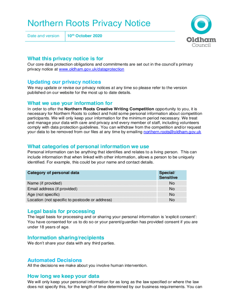 Northern Roots Privacy Notice Date and version10th October 2020What this privacy notice is for Our core data protection obligations and commitments are set out in the councils primary privacy notice