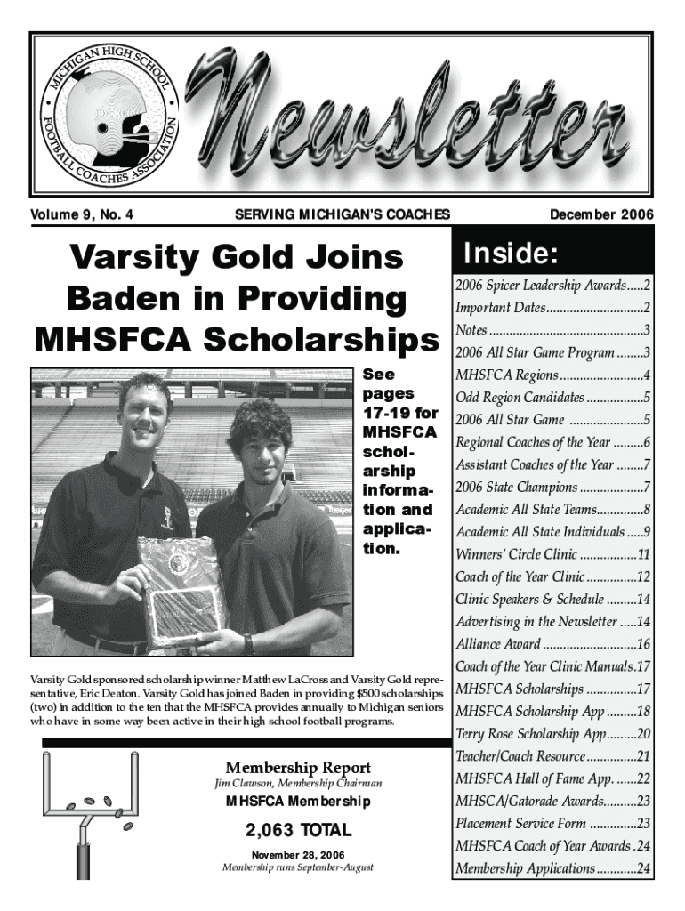 Michigan High School Football Coaches AssociationVolume 9, No. 4SERVING MICHIGAN\'S COACHES December 2006Inside: Varsity Gold Joins Baden in Providing MHSC Scholarships2006 Spicer Leadership Awards......2