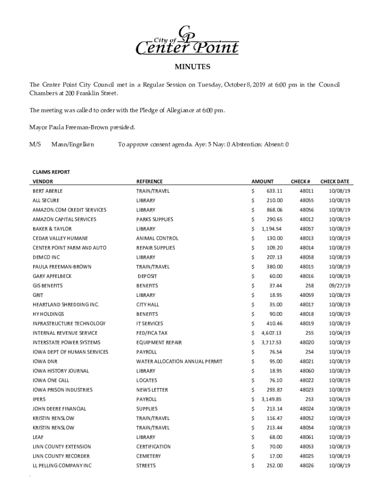 The Center Point City Council met in a Regular Session on Tuesday, October 8, 2019, at 6:00 pm in the Council