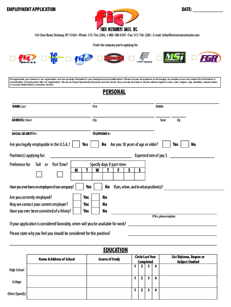 EMPLOYMENT APPLICATIONDATE: ___161 Clear Road, Brisbane, NY 13424 Phone: 3157362206, 18005000347 Fax: 3157362285 Email: info@fiberinstrumentsales.com Check the company you're applying for: R E A R