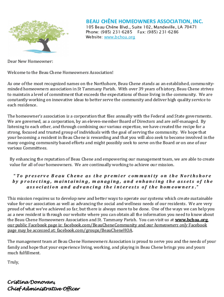 BEAU CONE HOMEOWNERS ASSOCIATION, INC. 105 Beau Cone Blvd., Suite 102, Mandeville, LA 70471 Phone: (985) 2316285 Fax: (985) 2316286 Website: www.bchoa.orgDear New Homeowner: Welcome to the Beau Chen