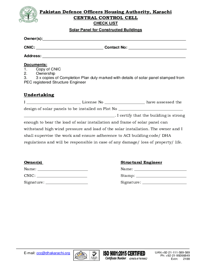 Pakistan Defense Officers Housing Authority, Karachi CENTRAL CONTROL CELL CHECK LIST Solar Panel for Constructed Buildings Owner(s):___ CNIC: ___ Contact No: ___ Address: ___ Documents: 1. Copy of