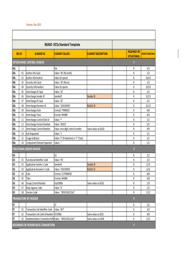Version: Mar 2021NSASO 837p Standard Template SEG ELEMENT VALUESELEMENT DESCRIPTIONINTERCHANGE CONTROL HEADER ISA ISA01 02 03 04 05 06 07 08 09 10 11 12 13 14 15 16Author Info Equal Author Information