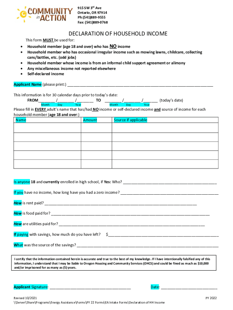 915 SW 3rd Ave Ontario, OR 97914 pH:(541)8899555 Fax: (541)8890768DECLARATION OF HOUSEHOLD INCOME This form MUST be used for: Household member (age 18 and over) who has NO income Household member