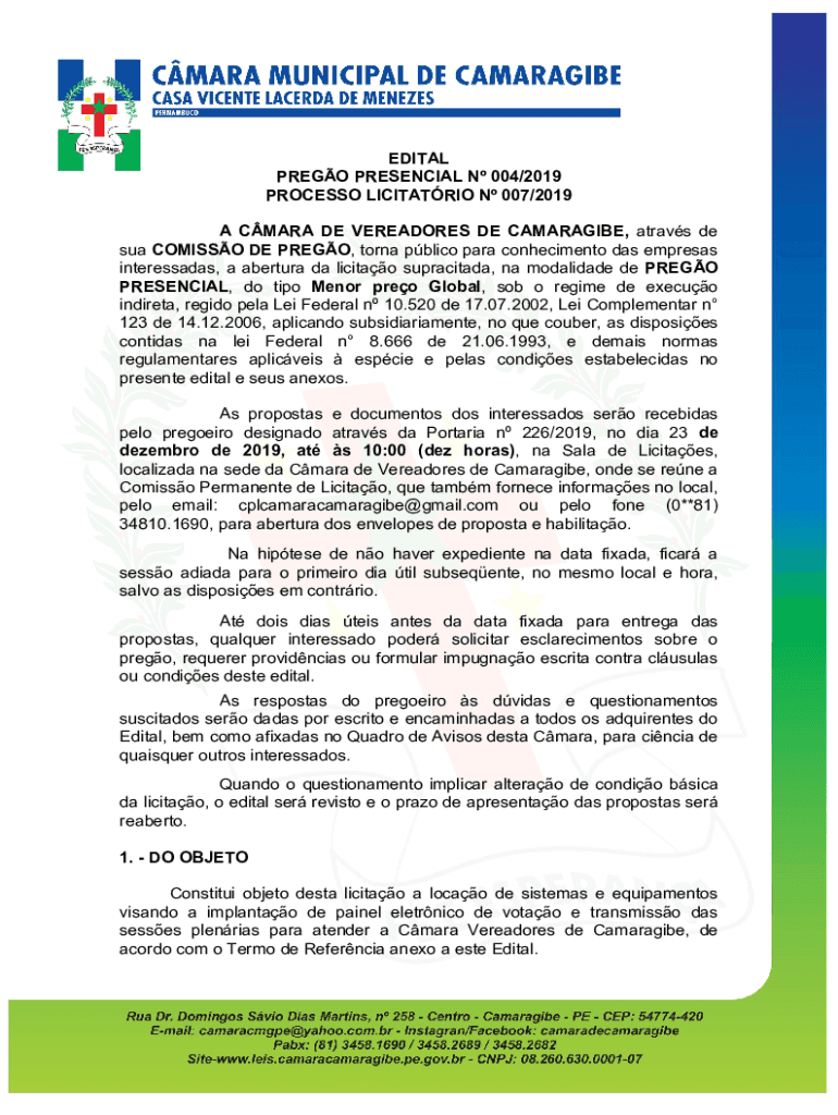 EDIT AL PRESO PRESENCE N 004/2019 PROCESS LIMITATION N 007/2019 A CLARA DE TOREADORS DE CAMARAGIBE, trans de SUA COMICS DE PRESO, torn public para conhecimento was empress interessadas, an aperture