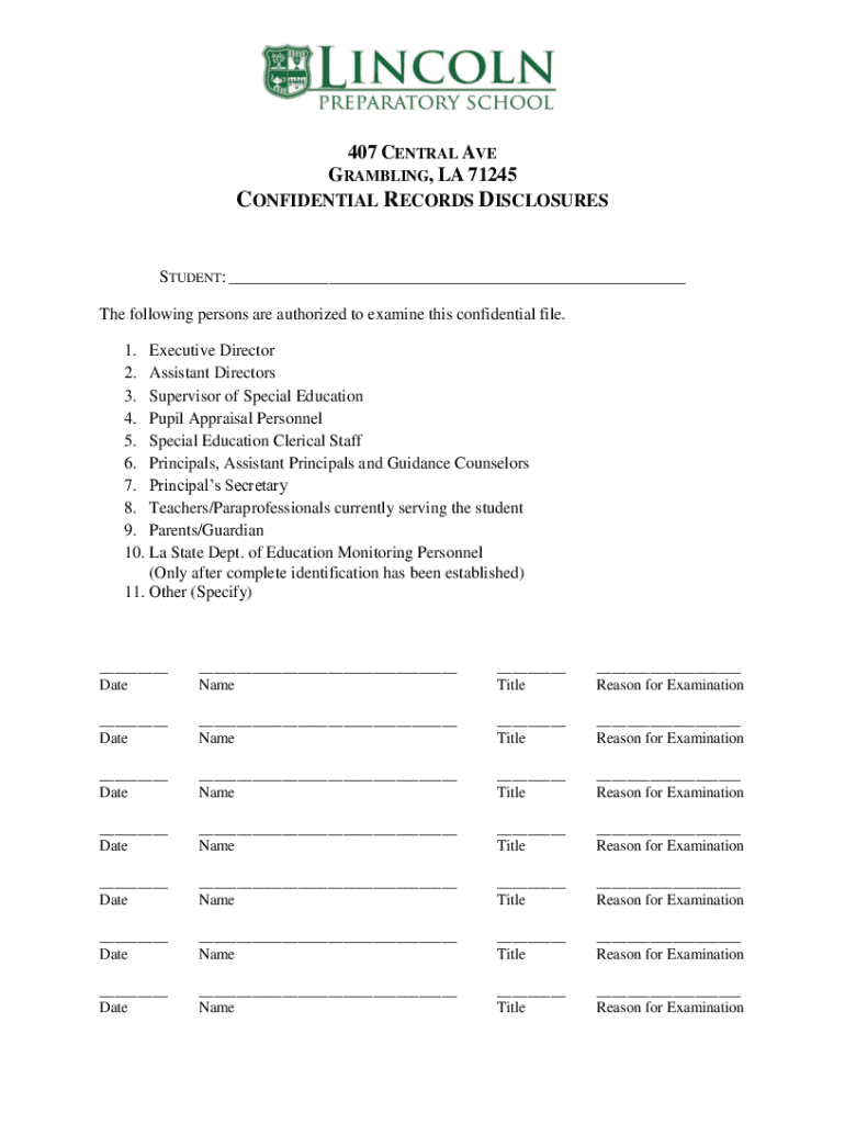 407 CENTRAL AVE GAMBLING, LA 71245CONFIDENTIAL RECORDS DISCLOSURESSTUDENT: ___ The following persons are authorized to examine this confidential file. 1. Executive Director 2. Assistant Directors
