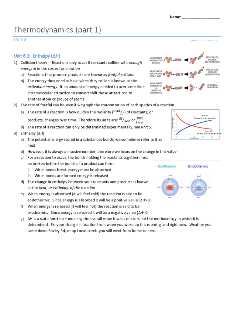 Name: ___Thermodynamics (part 1) Unit 6(SEV e n cl an s per i o d s)Unit 6.1: Enthalpy (H) 1) Collision theory Reactions only occur if reactants collide with enough energy & in the correct orientation