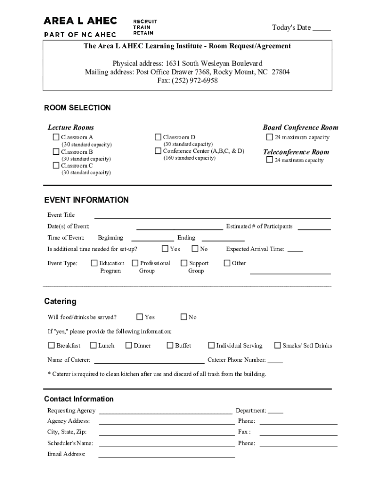 Today\'s Date The Area LA HEC Learning Institute Room Request/Agreement Physical address: 1631 South Wesleyan Boulevard Mailing address: Post Office Drawer 7368, Rocky Mount, NC 27804 Fax: (252) 9726958