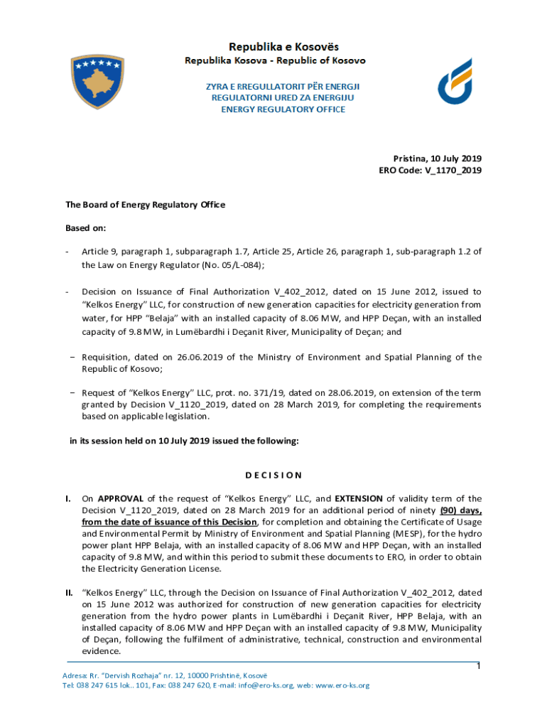 Priština, 10 July 2019 ERO Code: V_1170_2019The Board of Energy Regulatory Office Based on: Article 9, paragraph 1, subparagraph 1.7, Article 25, Article 26, paragraph 1, subparagraph 1.2 of the