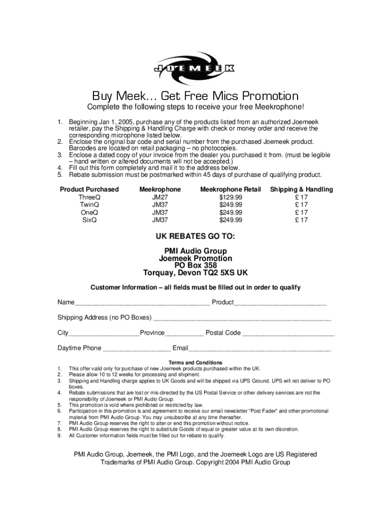 Buy Meek Get Free Mics Promotion Complete the following steps to receive your free Microphone! 1. Beginning Jan 1, 2005, purchase any of the products listed from an authorized Joe meek retailer, pay