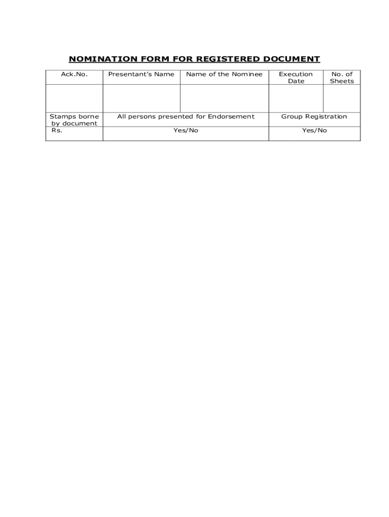 NOMINATION FORM FOR REGISTERED DOCUMENT ACK. No. Stamps borne by document Rs. Present ants Namesake of the NomineeExecution Date No. Of Sheets persons presented for EndorsementGroup Registrations/Noyes/No.