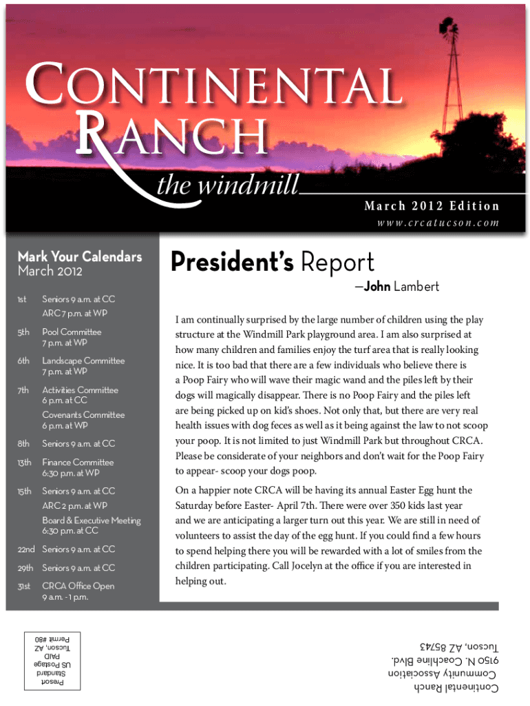 The windmill March 2012 Edition w w w.CRC ATC son.com1stSeniors 9 a.m. at CC ARC 7 p.m. at WP5thPool Committee 7 p.m. at WP6thLandscape Committee 7 p.m. at WP7thActivities Committee6 p.m. at Covenants