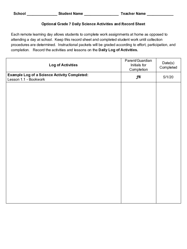School ___ Student Name ___ Teacher Name ___ Optional Grade 7 Daily Science Activities and Record Sheet Each remote learning day allows students to complete work assignments at home as opposed to