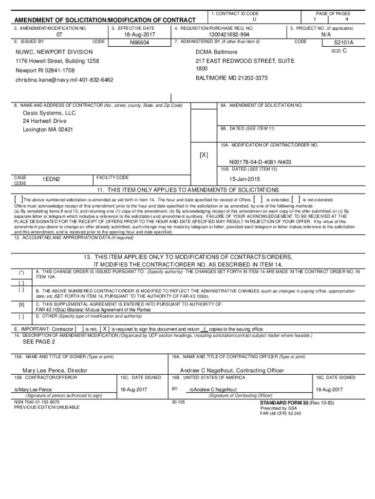 1. CONTRACT ID CODE2. AMENDMENT/MODIFICATION NO.3. EFFECTIVE DATE07 6. ISSUED BYCODE18Aug2017 N66604PAGE OF PAGESUAMENDMENT OF SOLICITATION/MODIFICATION OF CONTRACT14. REQUISITION/PURCHASE REQ. NO.45.