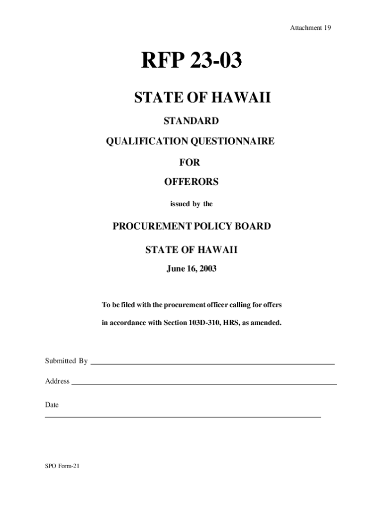 Attachment 19RFP 2303 STATE OF HAWAII STANDARD QUALIFICATION QUESTIONNAIRE FOR OFFER ORS issued by procurement POLICY BOARD STATE OF HAWAII June 16, 2003To be filed with the procurement officer calling