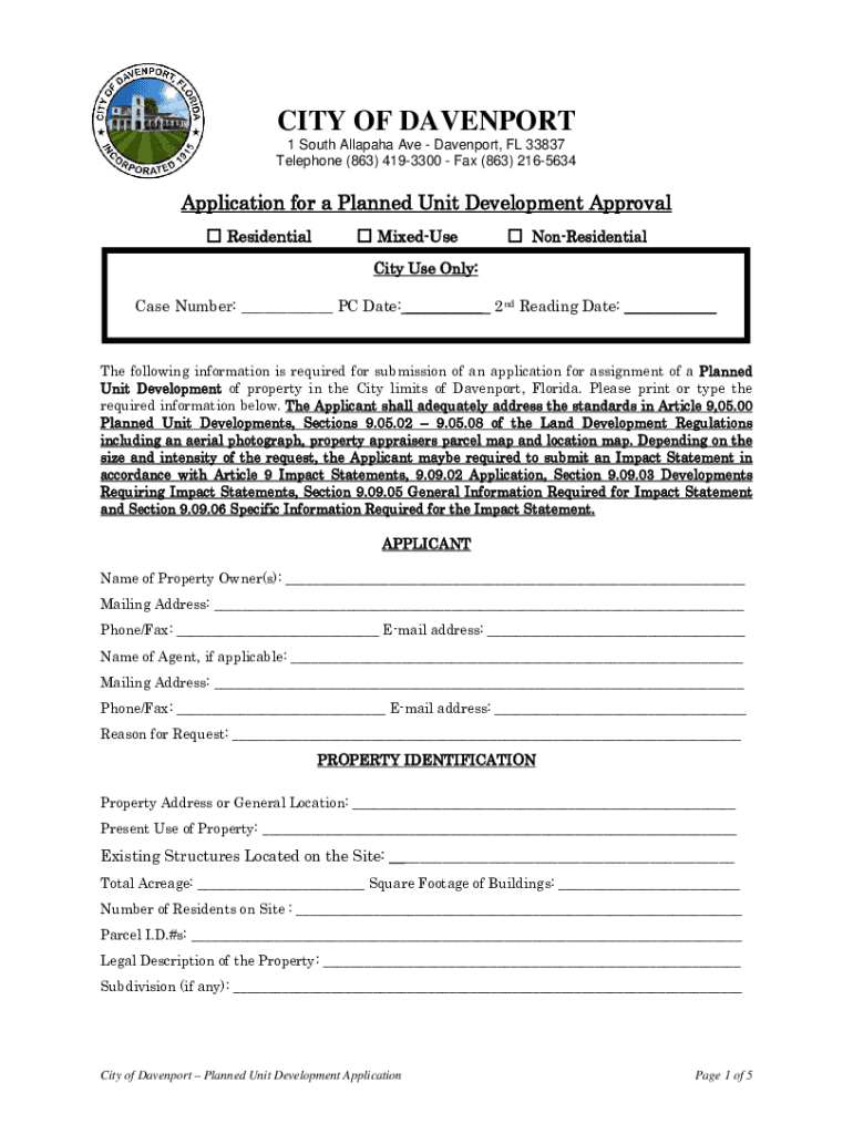 CITY OF DAVENPORT 1 South Altamaha Ave Davenport, FL 33837 Telephone (863) 4193300 Fax (863) 2165634Application for a Planned Unit Development Approval Residential Mixed NonResidentialCity Use Only: