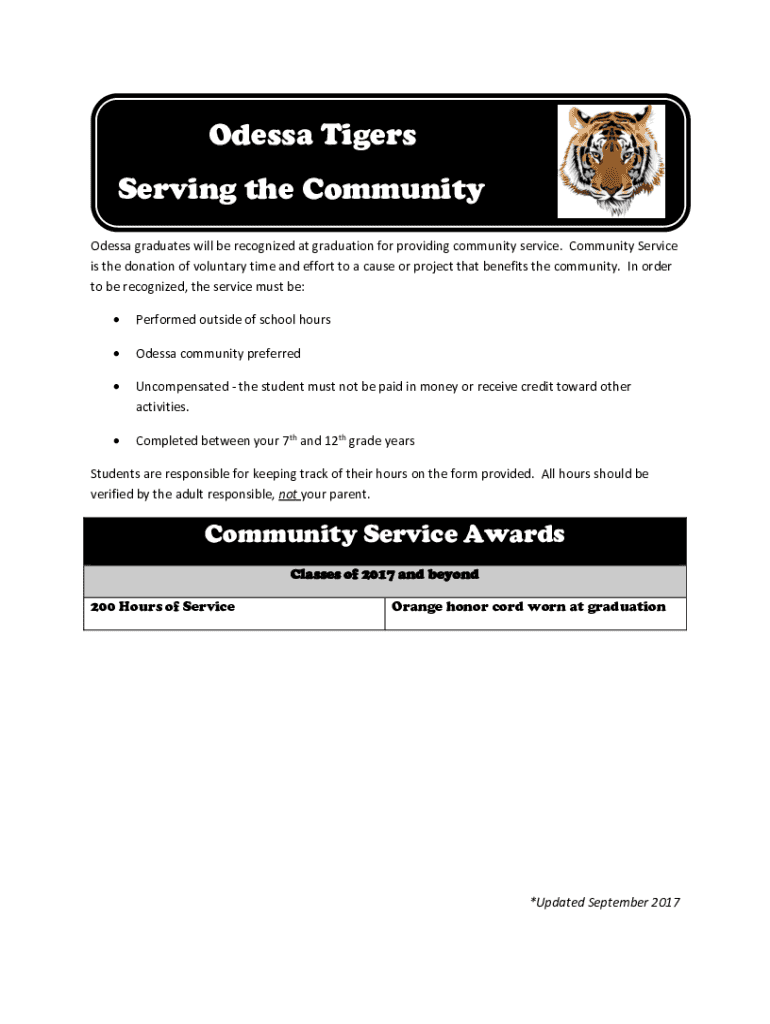 Odessa Tigers Serving the Community Odessa graduates will be recognized at graduation for providing community service. Community Service is the donation of voluntary time and effort to a cause or