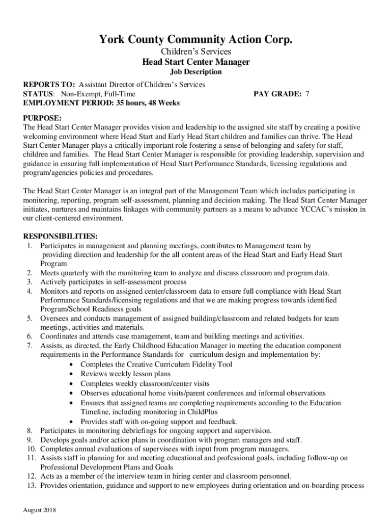 York County Community Action Corp. Children's Services Head Start Center Manager Job Description REPORTS TO: Assistant Director of Children's Services STATUS: Nonexempt, Halftime EMPLOYMENT PERIOD:
