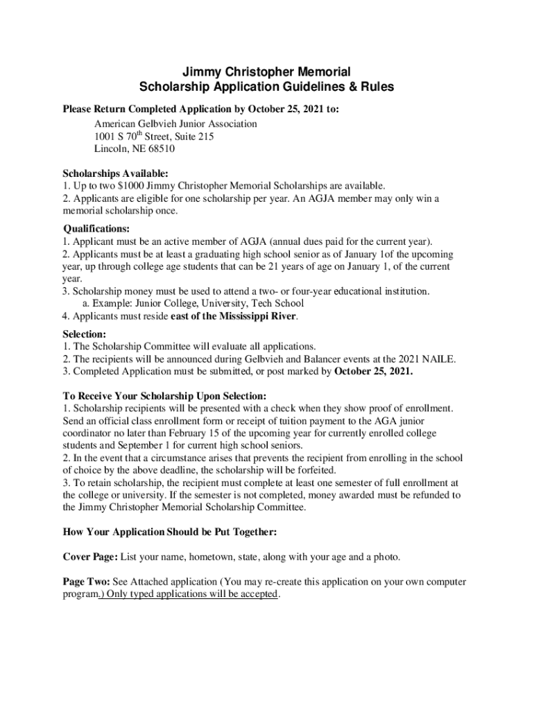 Jimmy Christopher Memorial Scholarship Application Guidelines & Rules Please Return Completed Application by October 25, 2021, to: American Gelbvieh Junior Association 1001 S 70th Street, Suite 215