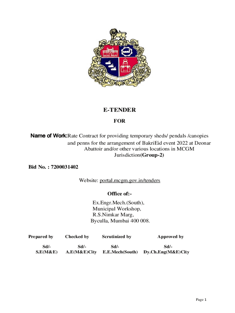 TENDER FOR Name of Work:Rate Contract for providing temporary sheds/ pedals /canopies and Penn for the arrangement of Married event 2022 at Leonard Abattoir and/or other various locations in MCG Jurisdiction(Group2)