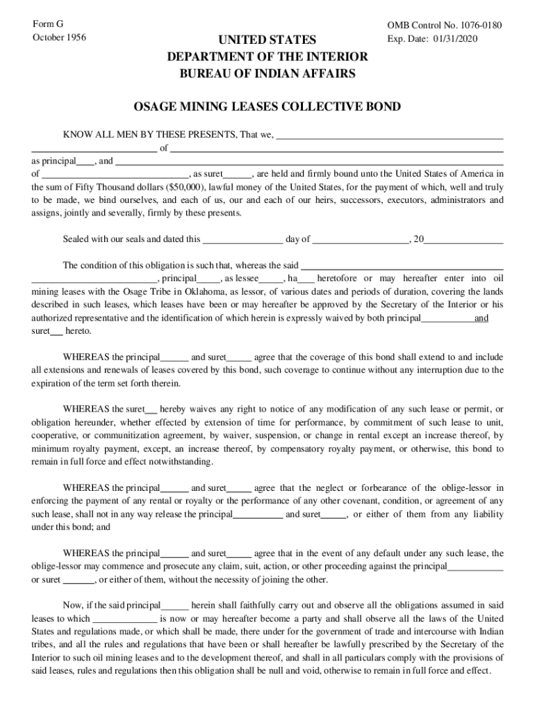 Form G October 1956UNITED STATES DEPARTMENT OF THE INTERIOR BUREAU OF INDIAN AFFAIRS OMB Control No. 10760180 Exp. Date: 01/31/2020OSAGE MINING LEASES COLLECTIVE BOND KNOW ALL MEN BY THESE PRESENTS,