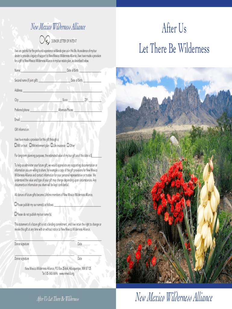 After Us Let There Be Wildernesses Mexico Wilderness Alliance DONOR LETTER OF INTENT I/we are grateful for the profound experience wild lands give us in this life. As evidence of my/our desire to