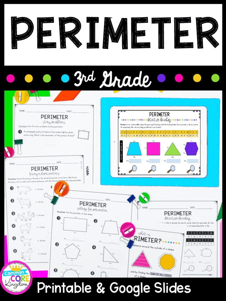 PERIMETER 3rd GradePrintable & Google SlidesPERIMETER 3rd grade 1. Anchor Chart (1 page)2. Solving for Perimeter (6 pages) 3. Drawing Shapes (4 pages) 4. Determining Missing Side Lengths (2 pages)
