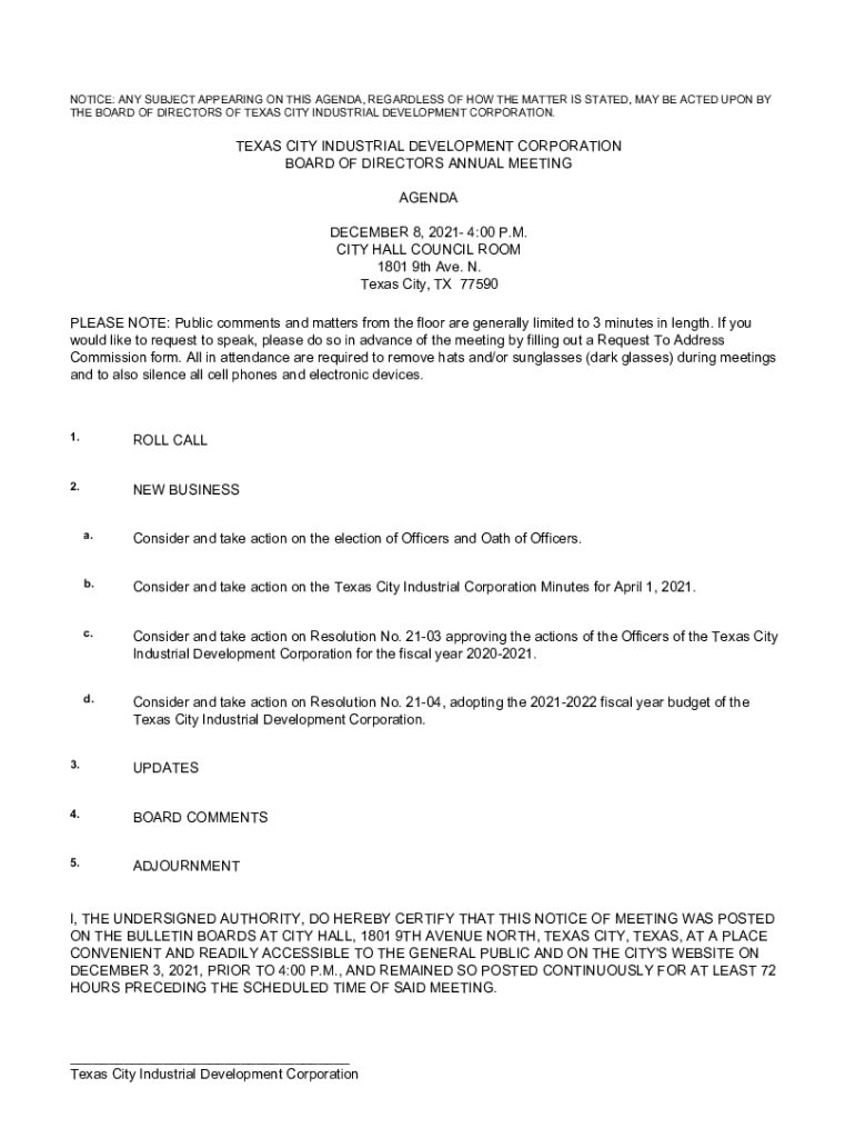 NOTICE: ANY SUBJECT APPEARING ON THIS AGENDA, REGARDLESS OF HOW THE MATTER IS STATED, MAY BE ACTED UPON BY THE BOARD OF DIRECTORS OF TEXAS CITY INDUSTRIAL DEVELOPMENT CORPORATION.TEXAS CITY INDUSTRIAL