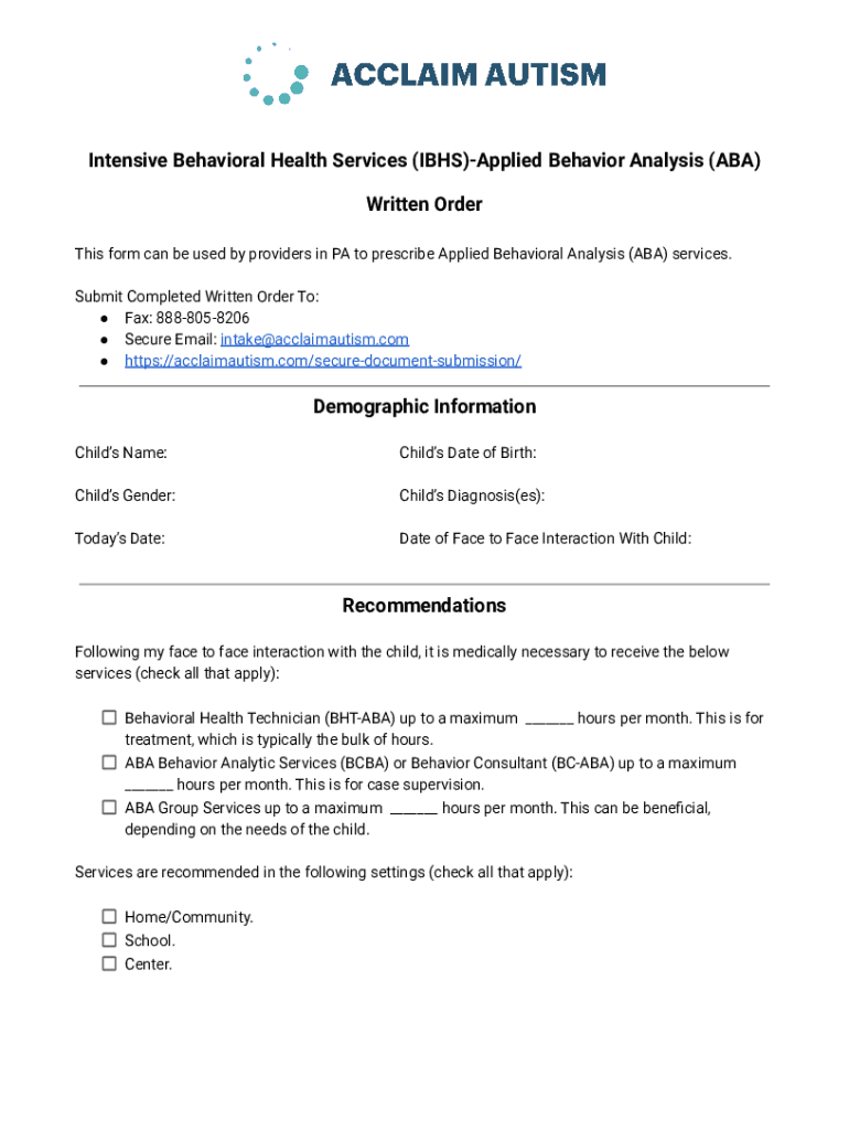 Intensive Behavioral Health Services (IHS)Applied Behavior Analysis (ABA) Written Order This form can be used by providers in PA to prescribe Applied Behavioral Analysis (ABA) services. Submit Completed