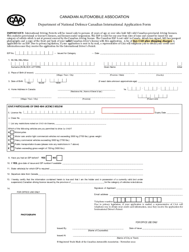 CANADIAN AUTOMOBILE ASSOCIATION Department of National Defense Canadian International Application Form IMPORTANT: International Driving Permits will be issued only to persons 18 years of age or over