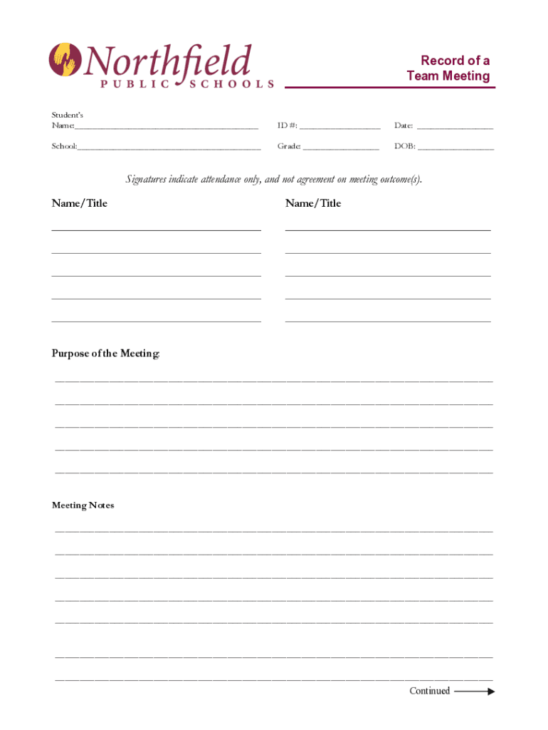 Record of a Team Meeting Students Name:___ID #: ___Date: ___School:___Grade: ___DOB: ___Signatures indicate attendance only, and not agreement on meeting outcome(s). Name/Filename/TitlePurpose of