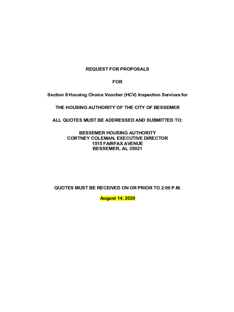 REQUEST FOR PROPOSALS FOR Section 8 Housing Choice Voucher (CV) Inspection Services for THE HOUSING AUTHORITY OF THE CITY OF BESSEMER ALL QUOTES MUST BE ADDRESSED AND SUBMITTED TO: BESSEMER HOUSING
