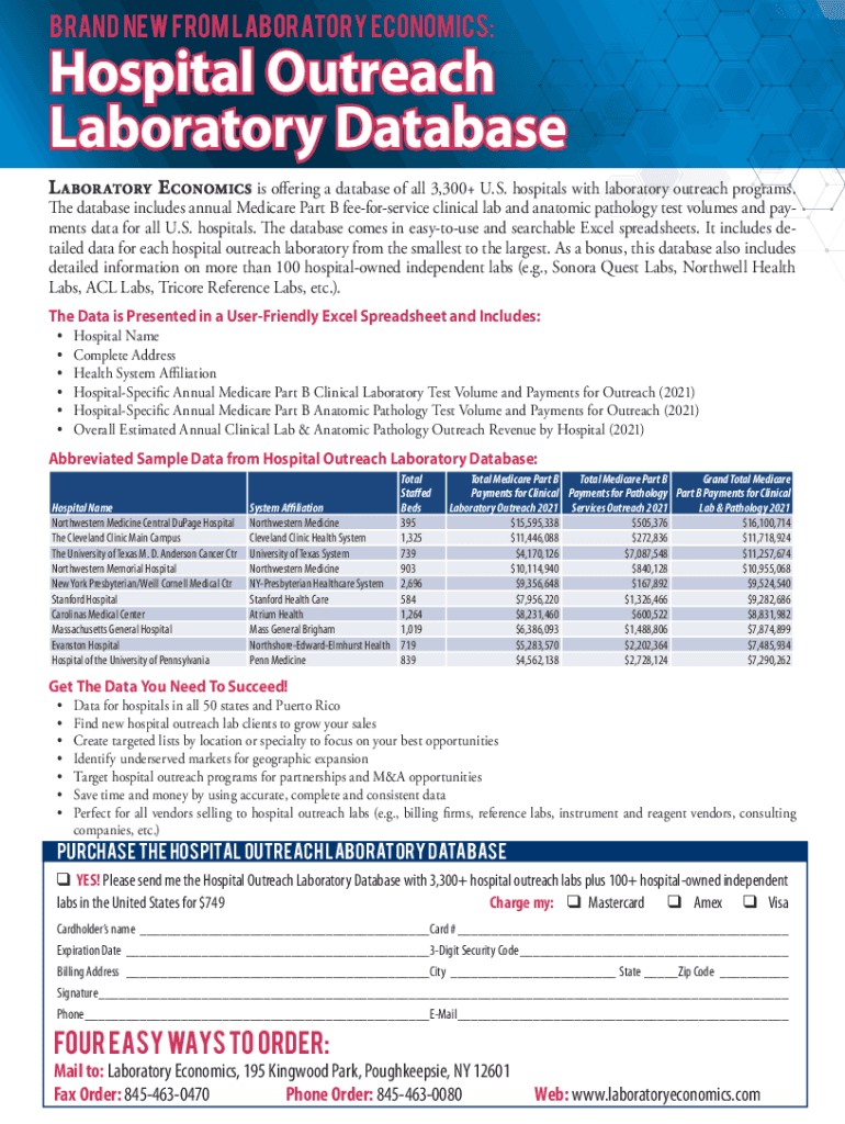 Brand New from Laboratory Economics:Hospital Outreach Laboratory Database L a for story Economics is offering a database of all 3,300+ U.S. hospitals with laboratory outreach programs. The database
