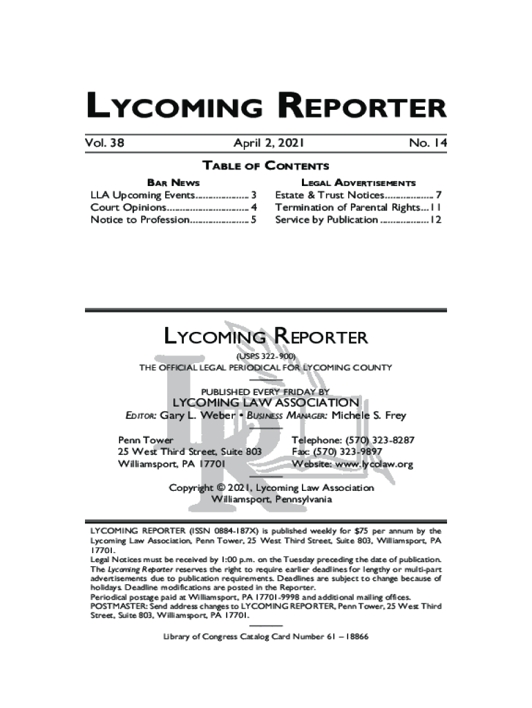Lycoming Reporter Vol. 38April 2, 2021No. 14Table of Contents Bar News LA Upcoming Events...................... 3 Court Opinions................................. 4 Notice to Profession........................