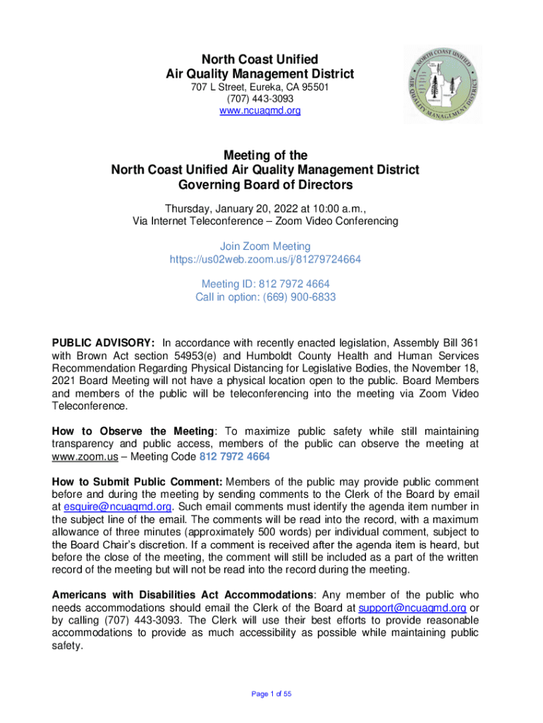 North Coast Unified Air Quality Management District 707 L Street, Eureka, CA 95501 (707) 4433093 www.ncuaqmd.orgMeeting of the North Coast Unified Air Quality Management District Governing Board of