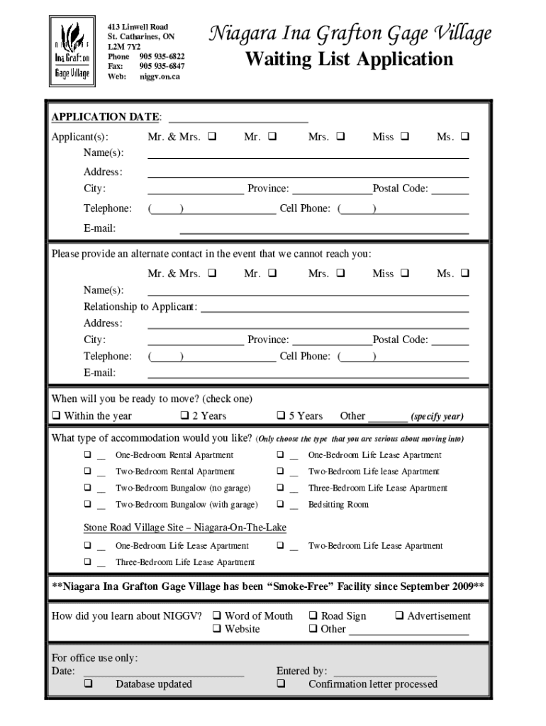 413 Lin well Road St. Catharines, ON L2M 7Y2 Phone 905 9356822 Fax: 905 9356847 Web: niggv.on.ca Niagara Ina Grafton Gage Village Waiting List ApplicationAPPLICATION DATE: Applicant(s): Name(s):Mr.