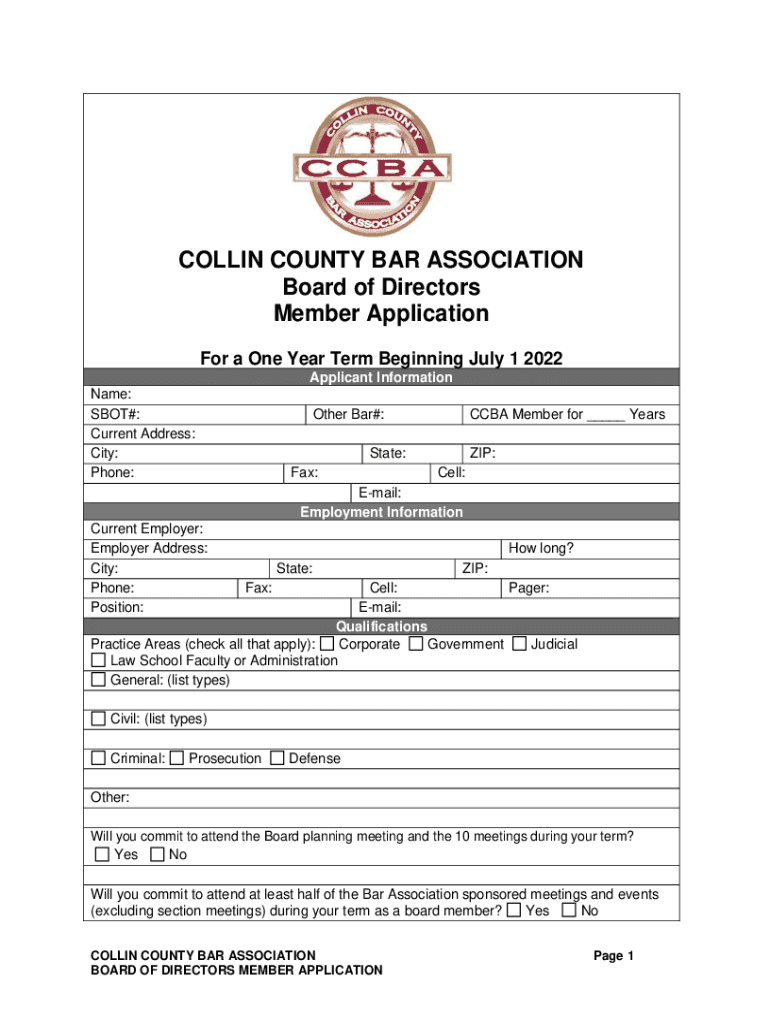 C COLLIN COUNTY BAR ASSOCIATION Board of Directors Member Application For a One-Year Term Beginning July 1, 2022, Applicant Information Name: SHOT#: Current Address: City: Phone:Other Bar#:CUBA Member