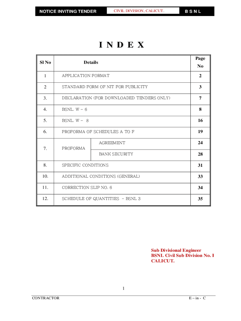 CIVIL DIVISION, CALICO.NOTICE INVITING TENDERBSNLI N D E X SL NoPageDetailsNo1APPLICATION FORMAT22STANDARD FORM OF NIT FOR PUBLICITY33.DECLARATION (FOR DOWNLOADED TENDERS ONLY)74.BSNL. W 685.BSNL.